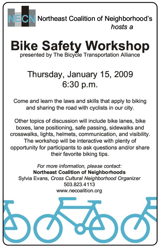 >The BTA and the NE Coalition of Neighborhoods is hosting a Bike Safety Workshop on Thursday the 15th.
