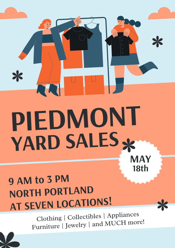 Hey PNA Members and friends, do you love perusing yard sales looking for hidden gems? Check out the merch in 8- Piedmont Neighborhood Yard Sales on Saturday, May 18, 9a-3p!