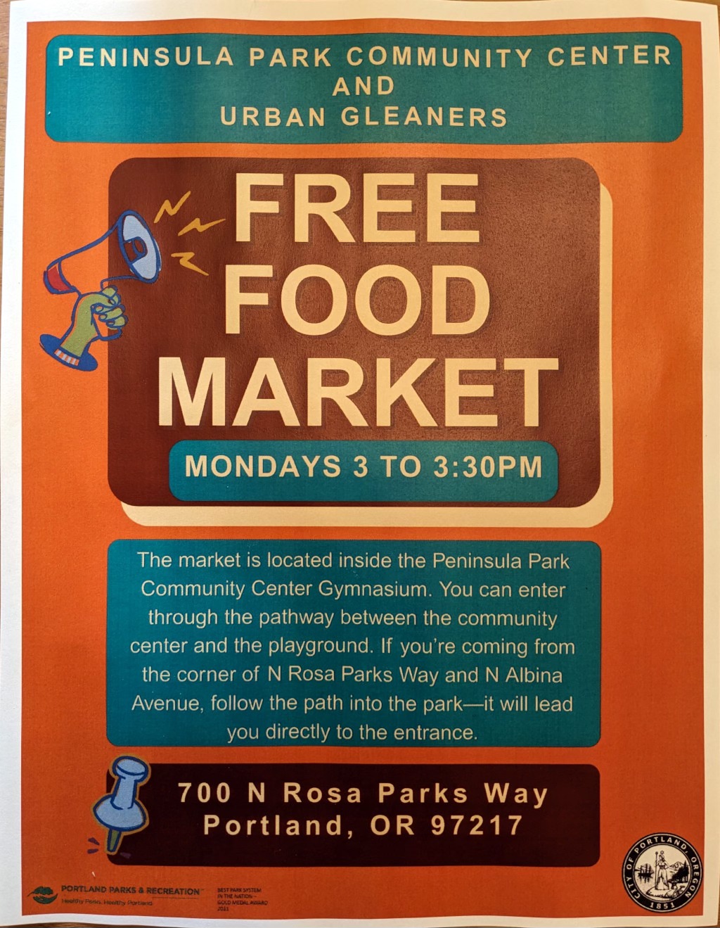 To address the dramatic increase of food insecurity experienced by our neighbors, the Peninsula Park Community Center has partnered with Urban Gleaners to launch a weekly Free Food Market—every Monday, 3:00 – 3:30p at the Peninsula Park Community Center Gymnasium, 700 N. Rosa Parks Way.